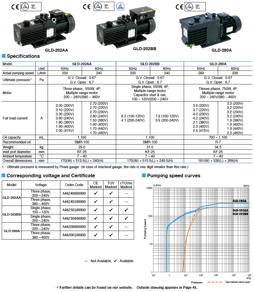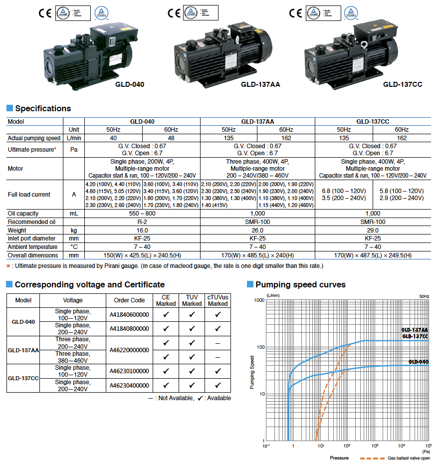 Small Oil Vacuum Pump GLD series features high perfomance, low vibration and noise and several functions such as ballast valve, oil-back-flow prevention mechanism, and large sized oil level gauge.  This series equips multi-voltage motor and correspondent to international standard.